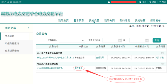 (1)發(fā)電企業(yè)單邊掛牌交易時(shí),請(qǐng)發(fā)電企業(yè)在申報(bào)截止時(shí)間之前,點(diǎn)擊“售方申報(bào)”,進(jìn)入售方申報(bào)頁(yè)面: