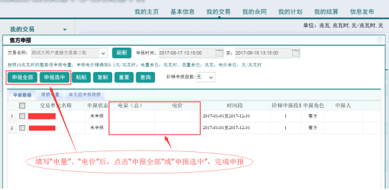 填寫(xiě)“電量”、“電價(jià)”后,選擇“申報(bào)全部”或“申報(bào)選中”,完成申報(bào):