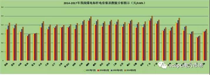 2014到2017年之間,我國各省的煤電標(biāo)桿電價(jià)的對比情況主要如下圖所示。