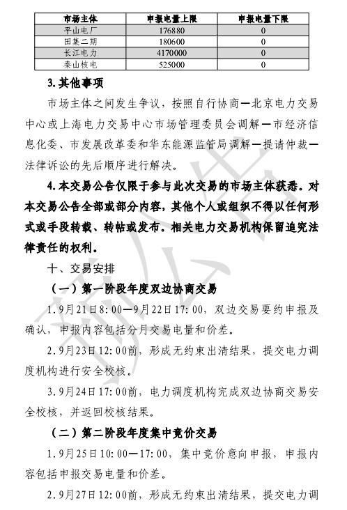 2017年9月19日,上海電力交易中心發(fā)布《2017年10-12月上海年度電力直接交易預(yù)公告》?!额A(yù)公告》中發(fā)布的交易時(shí)間為:2017年10月1日-2017年12月31日,交易電量為40億千瓦時(shí)。分別為雙邊協(xié)商交易和集中競(jìng)價(jià)交易兩