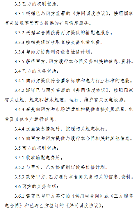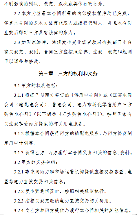 國家能源局江蘇監(jiān)管辦《日前發(fā)布了江蘇電力直接交易三方合同(示范文本)》,詳情如下:關(guān)于印發(fā)《江蘇電力直接交易三方合同(示范文本)》的通知各有關(guān)單位:為貫徹落實《中共中央國務(wù)院關(guān)于進(jìn)一步深化電力體制改革