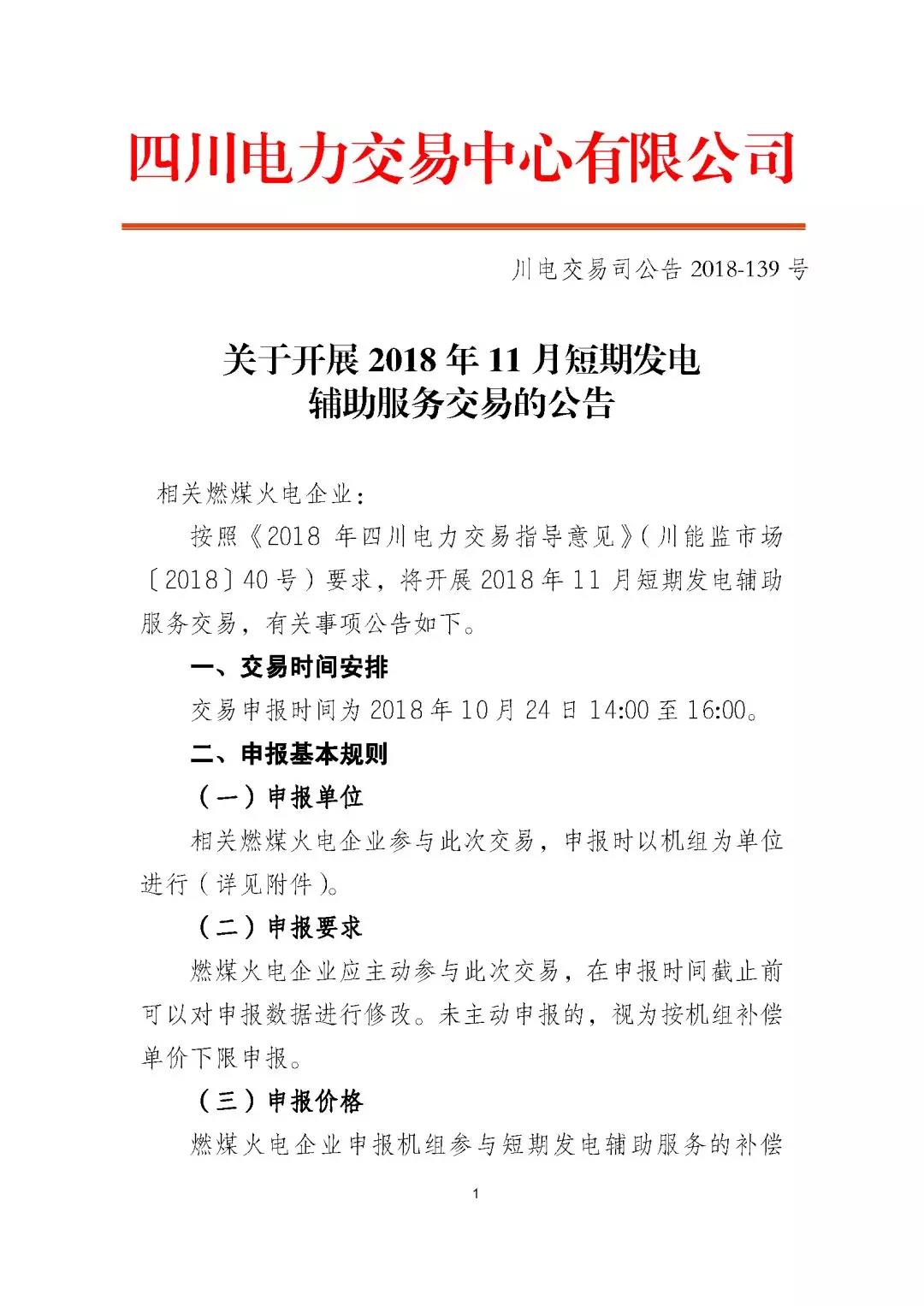 公告 | 四川關于開展2018年11月短期發(fā)電輔助服務交易的公告