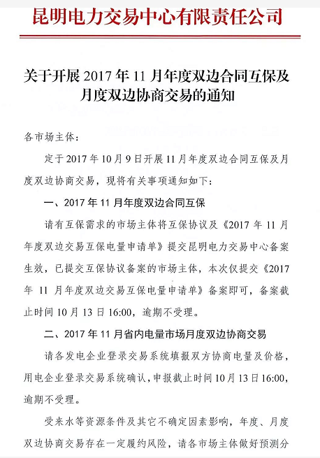 云南將開展2017年11月年度雙邊合同互保及月度雙邊協(xié)商交易