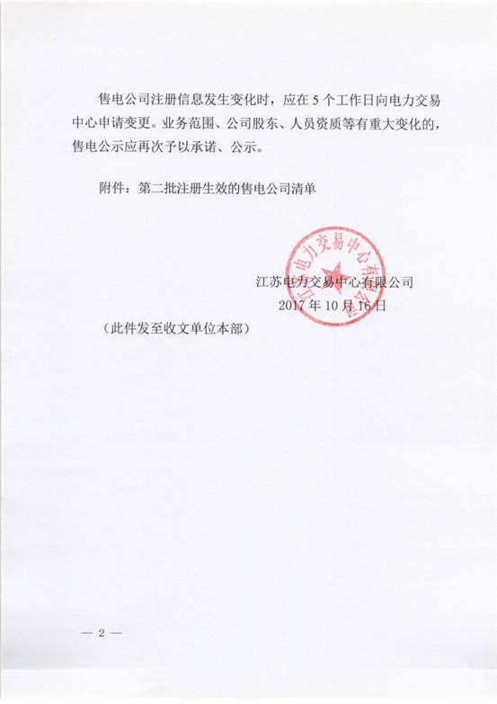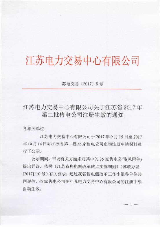 10月16日,江蘇電力交易中心發(fā)布了關(guān)于2017第二批售電公司公示結(jié)果的公告 ,2017年9月15日至2017年10月14日對(duì)受理注冊(cè)的35家售電公司公示,所有35家售電公司(名單見附件)在江蘇電力交易中心的注冊(cè)手續(xù)自動(dòng)生效。