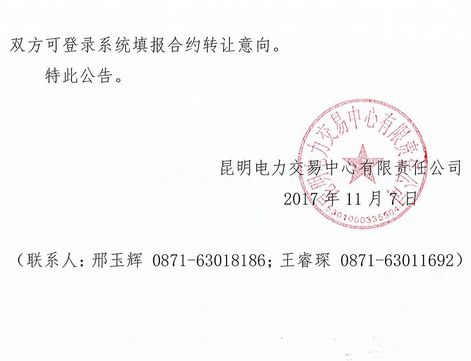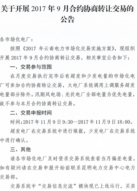 云南《關(guān)于開展2017年9月合約協(xié)商轉(zhuǎn)讓交易的公告》