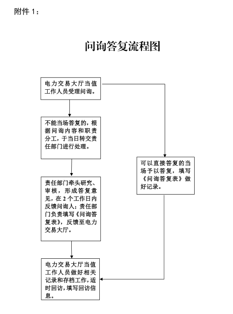 第七條 電力交易大廳當(dāng)值工作人員負(fù)責(zé)問詢答復(fù)工作的管理,包括渠道的建立、受理、組織研究答復(fù)意見并回復(fù)等工作。