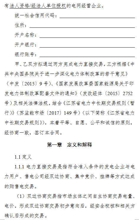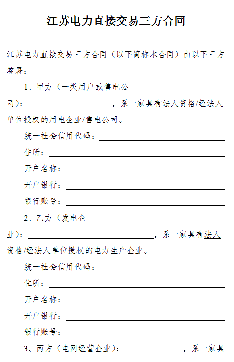 江蘇印發(fā)《江蘇電力直接交易三方合同(示范文本)》的通知