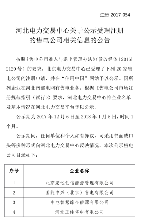 河北電力交易中心日前發(fā)布了關(guān)于受理注冊(cè)的售電公司相關(guān)信息的公告,河北電力交易中心受理了河北榮毅通信有限公司等8家售電公司的注冊(cè)申請(qǐng),另外還公示了北京電力交易中心推送的20家售電公司,詳情如下: