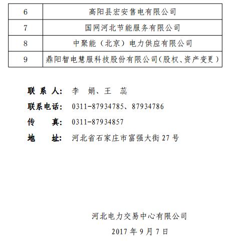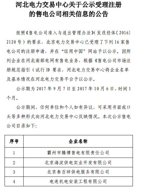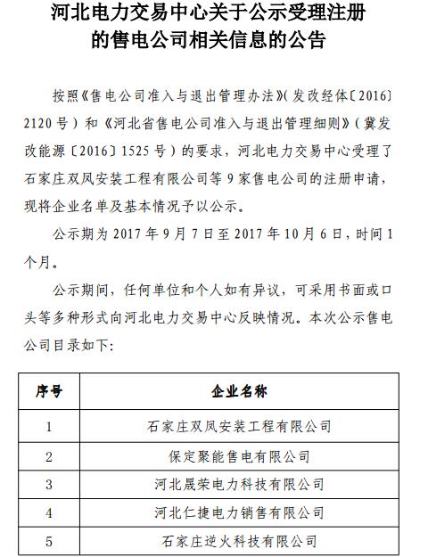 2017年9月7日,河北電力交易中心發(fā)布《河北電力交易中心關(guān)于公示受理注冊的售電公司相關(guān)信息的公告》。公告中稱,對于河北電力交易中心受理的石家莊雙鳳安裝工程有限公司等9家售電公司,以及對北京電力中心受理并