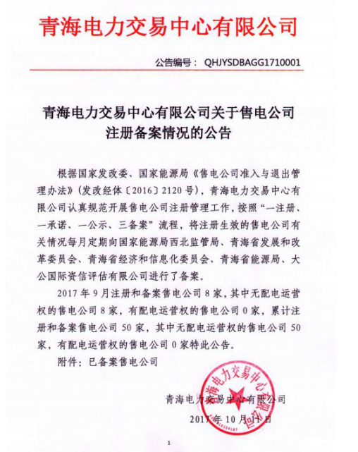 2017年10月10日,青海電力交易中心發(fā)布售電公司注冊備案情況的公告。2017年9月青海省注冊和備案售電公司8家,其中無配電運營權的售電公司8家,有配電運營權的售電公司0家。青海省累計注冊和備案售電公司50家,其