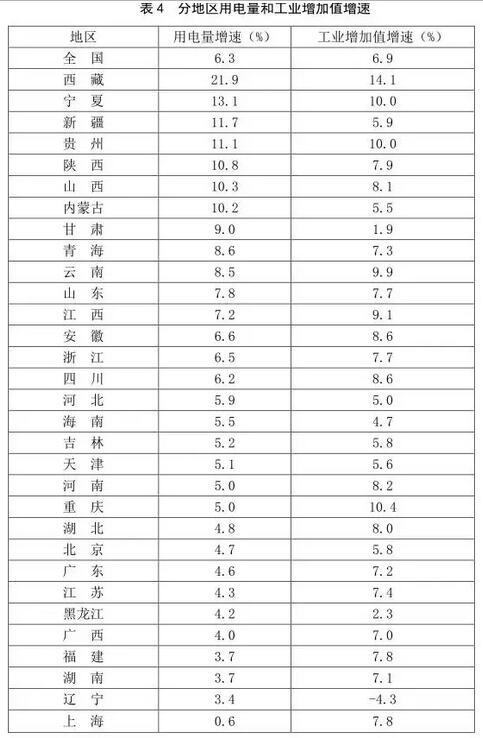 上半年,地區(qū)間能源消費差異較大,這在一定程度上體現(xiàn)了經(jīng)濟增長和結構變化的地區(qū)差異。在用電量增速超過全國平均水平的14個?。ㄊ?、自治區(qū))中,除浙江、山東外,有12個省區(qū)是中西部地區(qū)。其主要原因是中西部地區(qū)高耗能行業(yè)較快發(fā)展。其中,新疆、內(nèi)蒙古、甘肅地區(qū)雖然用電量增速較高,但其工業(yè)增加值增速低于全國平均水平。
