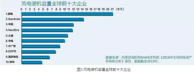五年來,國電集團平均每年新增風電裝機282萬千瓦,2016年底風電裝機規(guī)模2583萬千瓦,位居全球第一(見圖3)。