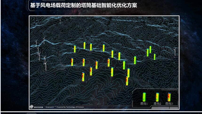 最后還有一部分,塔筒和基礎(chǔ),我們很欣慰的看到這幾年業(yè)界都已經(jīng)認(rèn)識(shí)到,哪怕只有一種機(jī)型,也不需要盲目保守的僅提供一種塔筒重量,包括基礎(chǔ)也是一樣的,就拿遠(yuǎn)景EN-121/2.2MW機(jī)型,設(shè)計(jì)風(fēng)速6.5米的風(fēng)速,湍流是B,我們有一個(gè)風(fēng)場(chǎng)測(cè)試下來之后風(fēng)速是5.98米,湍流是C,這是先把風(fēng)速轉(zhuǎn)化為到機(jī)位的基礎(chǔ)載荷,再結(jié)合我們的格林模塊給出最優(yōu)的塔筒和基礎(chǔ)設(shè)計(jì),當(dāng)然我們也會(huì)靈活考慮落地性,不會(huì)說十多個(gè)機(jī)位,就提供十多個(gè)塔筒。