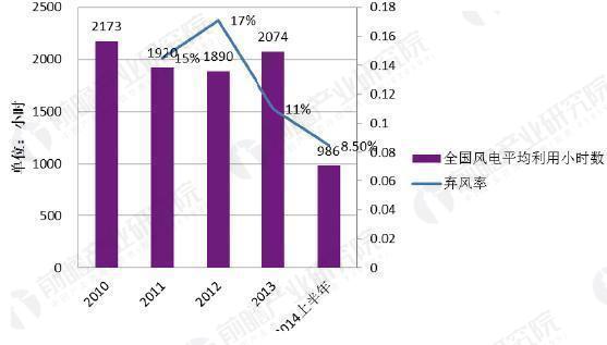 中國風(fēng)電年平均利用小時(shí)數(shù)和棄風(fēng)率