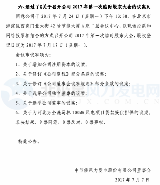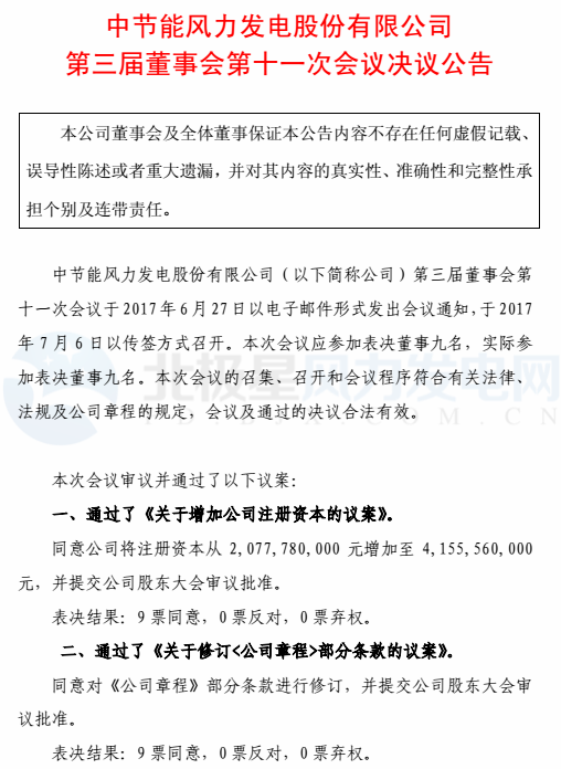 中節(jié)能風力發(fā)電股份有限公司第三屆董事會第十一次會議于2017年7月6日召開,會議審議通過了《關(guān)于增加公司注冊資本的議案》、《關(guān)于提名公司獨立董事候選人的議案》、《關(guān)于投資建設(shè)洗馬林100MW風電場項目的議案》等事項。其中,公司注冊資本由原來20億元變更為42億元;提名秦海巖、姜軍為公司獨董候選人;同意投資建設(shè)河北萬全洗馬林100MW 風電場項目,項目總投資為 80,528 萬元。以下是公告原文: