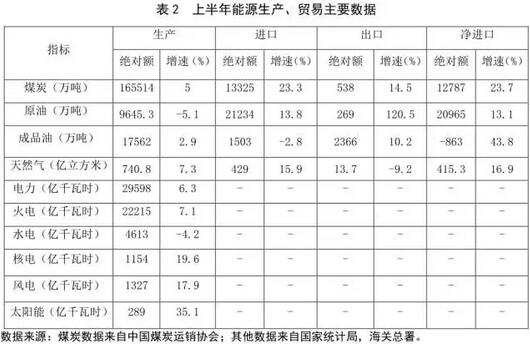 總體上看,上半年能源生產增速都有顯著提高,能源進口仍保持高速增長態(tài)勢。其中,煤炭產量165514萬噸,同比增長5%,由第一季度的負增長轉為正增長;煤炭進口量13325萬噸,同比增長23.3%,增幅較去年全年(25.2%)收窄1.9個百分點;出口量538萬噸,同比增長14.5%,而去年全年煤炭出口量增長64.5%;凈進口量12787萬噸,同比增長23.7%。原油產量9645.3萬噸,同比下降5.1%,降幅較去年全年(6.9%)收窄1.8個百分點;原油進口量21234萬噸,同比增長13.8%,增幅較去年全年(13.6%)增長0.2個百分點;出口量269萬噸,同比增長120.5%,增幅較去年全年(2.6%)提高117.9個百分點;凈進口量20965萬噸,同比增長13.1%。成品油產量17562萬噸,同比增長2.9%;進口量1503萬噸,同比下降2.8%,降幅較去年全年(6.5%)收窄3.7個百分點;出口量2366萬噸,同比增長10.2%,增幅較去年全年(33.7%)收窄23.5個百分點;凈出口量863萬噸,同比增長43.8%。天然氣產量740.8億立方米,同比增長7.3%,增幅較去年全年(2.2%)提高5.1個百分點;天然氣進口量429億立方米,同比增長15.9%,增幅較去年全年(22.0%)收窄6.1個百分點;出口量13.7億立方米,同比下降9.2%,而去年全年天然氣出口量增長4.1%;凈進口量415.3億立方米,同比增長16.9%。
