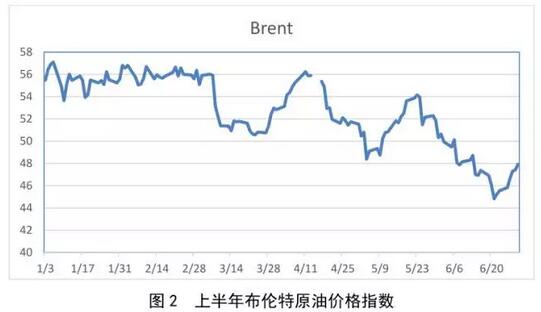 石油方面,國際上原油供大于求的格局仍然沒有改變,國際油價呈現(xiàn)震蕩下降的形態(tài)。布倫特原油期貨價格從今年年初的55.47美元/桶下降至6月底47.92美元/桶,累計下降7.55美元/桶。
