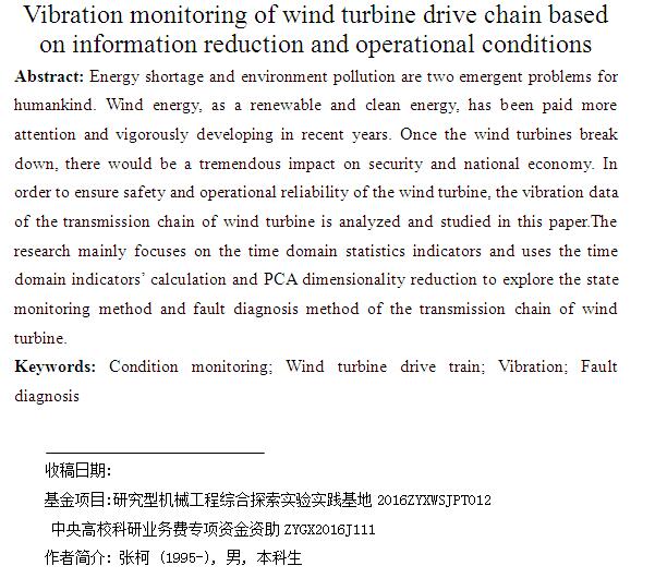 在已投產(chǎn)的風(fēng)電機(jī)組中,其傳動(dòng)鏈結(jié)構(gòu)比較復(fù)雜,一直是風(fēng)電機(jī)組故障的多發(fā)區(qū)。振動(dòng)信號作為傳動(dòng)鏈故障特征信息的載體,能夠有效地反映風(fēng)電機(jī)組傳動(dòng)鏈絕大部分的故障信息。但是, 目前風(fēng)電監(jiān)測的振動(dòng)數(shù)據(jù)動(dòng)輒十余處, 而且每處的振動(dòng)信號又可以進(jìn)行各種時(shí)域、頻域分析,運(yùn)行工況又復(fù)雜多變,造成故障決策過程頭緒繁多,很難給出有效的分析和明確的結(jié)論。為了解決這個(gè)問題,本文基于真實(shí)風(fēng)電傳動(dòng)鏈數(shù)據(jù),在提取多個(gè)時(shí)域指標(biāo)的基礎(chǔ)上,引入PCA(Principle Component Analysis)降維技術(shù),考慮運(yùn)行工況, 并劃定運(yùn)行安全閾值,通過2-3個(gè)融合指標(biāo)反映設(shè)備的運(yùn)行狀態(tài), 為進(jìn)一步實(shí)現(xiàn)傳動(dòng)鏈的運(yùn)維服務(wù)決策提供切實(shí)可行的數(shù)據(jù)分析方案。