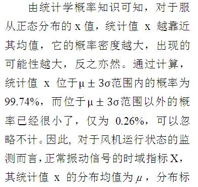 運(yùn)用統(tǒng)計(jì)指標(biāo)對風(fēng)機(jī)運(yùn)行狀態(tài)進(jìn)行監(jiān)測,必須為其正常狀態(tài)下振動(dòng)信號的統(tǒng)計(jì)指標(biāo)值確定一個(gè)變化范圍,當(dāng)統(tǒng)計(jì)值超出這個(gè)范圍時(shí),則判定風(fēng)機(jī)某機(jī)械部件運(yùn)行失常。對于一個(gè)連續(xù)測量,設(shè)備運(yùn)行狀態(tài)相對穩(wěn)定的數(shù)據(jù),可以看作近似服從正態(tài)分布。因此,完全可以認(rèn)為振動(dòng)數(shù)據(jù)的時(shí)域指標(biāo)值X服從正態(tài)分布: