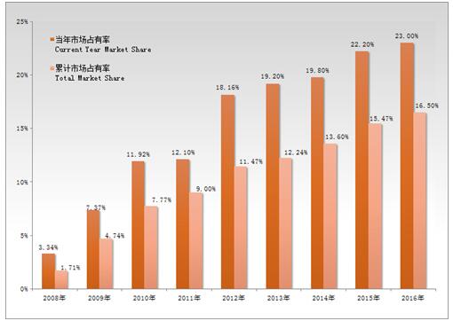 中復(fù)連眾、中材葉片同歸中國建材后二者總產(chǎn)能達(dá)到16GW,風(fēng)電葉片產(chǎn)品序列超過150款,產(chǎn)品批量出口美國、加拿大、印度、韓國等近40個國家和地區(qū),2016年風(fēng)機(jī)葉片整體裝機(jī)量占中國市場份額的35.5%,占全球市場份額的15.2%,位居世界第一。