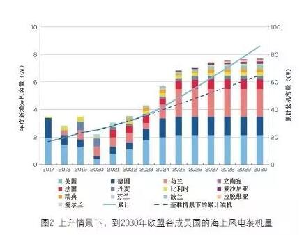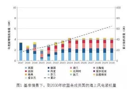 在基準(zhǔn)情景下,裝機(jī)主要來自于北海周邊國(guó)家,包括英國(guó)、丹麥、荷蘭、德國(guó)和法國(guó)等。而在上升情景下,愛爾蘭、波蘭、拉脫維亞以及立陶宛也會(huì)有新增裝機(jī)。