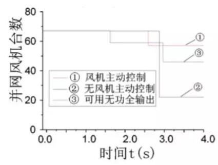 圖2 暫態(tài)擾動(dòng)期間風(fēng)電場(chǎng)并網(wǎng)風(fēng)機(jī)臺(tái)數(shù)對(duì)比