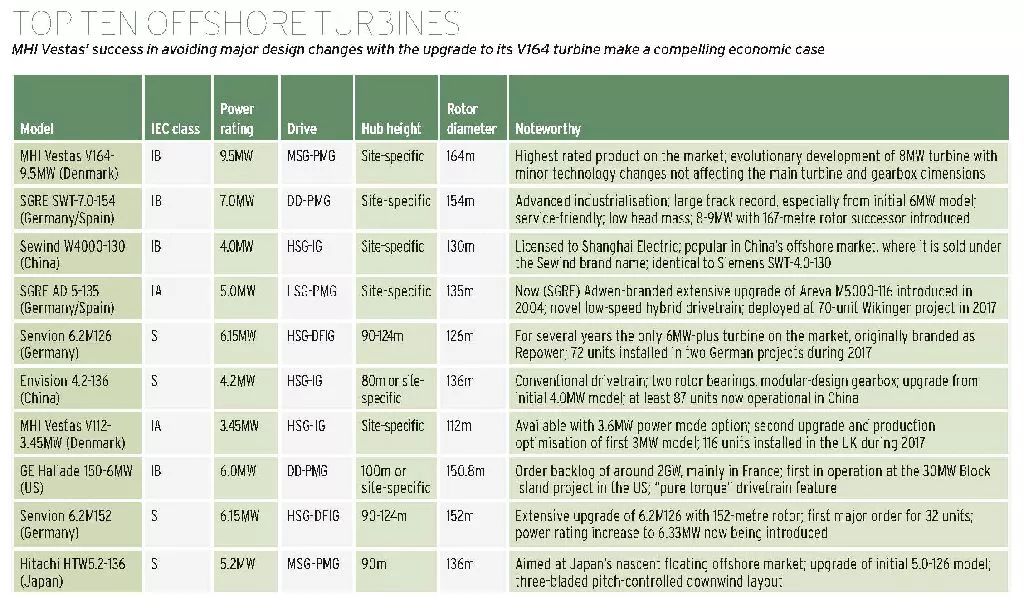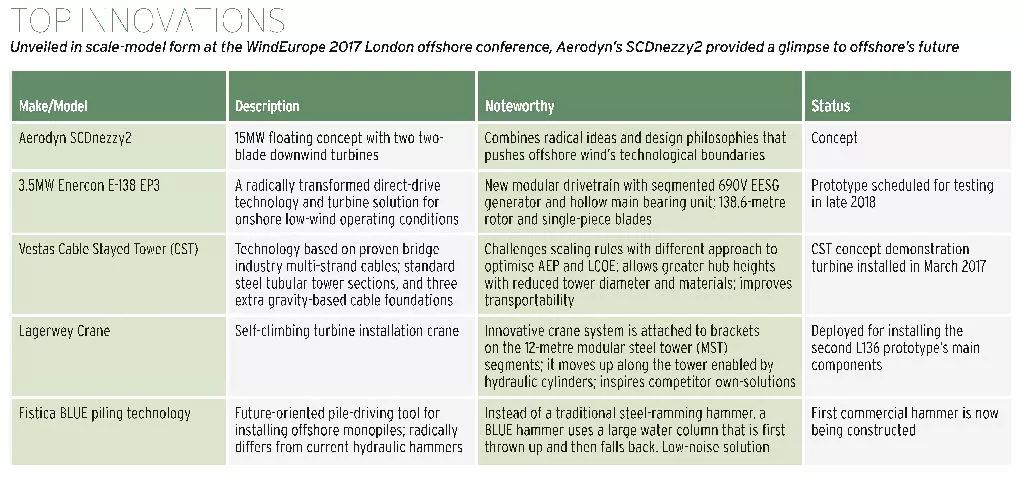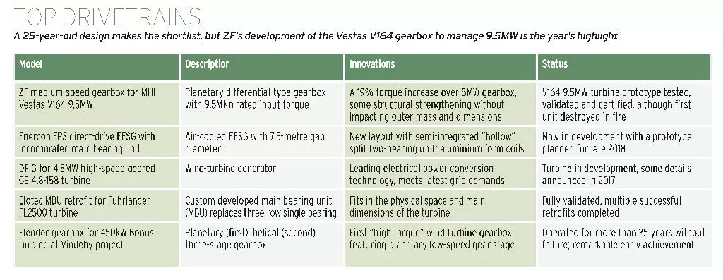 2017年末,Windpower Monthly啟動了一年一度的最佳風電機組評選。根據(jù)單機功率和應用的不同評選出了最佳陸上風電機組(2.9兆瓦以下), 最佳大功率陸上風電機組(3兆瓦以上)和最佳海上風電機組等六個獎項。