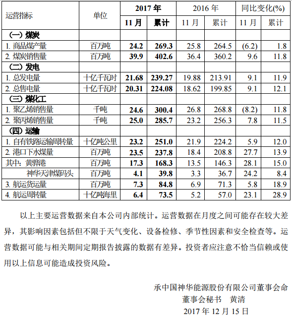 今日,中國神華能源股份有限公司公布了2017 年11 月份主要運(yùn)營數(shù)據(jù):11月份總發(fā)電量216 8億千瓦時(shí),同比增長6 1%;1-11月累計(jì)總發(fā)電量2392 7億千瓦時(shí),同比增長11 9%。11月份總售電量203 1億千瓦時(shí),同比增長9