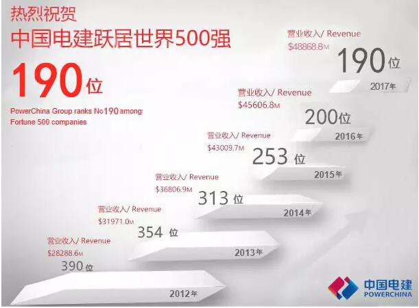 中國(guó)電建在《財(cái)富》雜志公布的2017年世界500強(qiáng)榜單中,排名再創(chuàng)新高,以營(yíng)業(yè)收入488.688億美元位列榜單第190位,較去年排名前進(jìn)了10位!不僅連續(xù)坐穩(wěn)《財(cái)富》世界500強(qiáng)交椅,排名更是年年“步步高升”。從2012年的第390位到2017年第190位,五年時(shí)間前進(jìn)了整整200位!在2016年度中央企業(yè)經(jīng)營(yíng)業(yè)績(jī)考核中名列第35名,連續(xù)五年獲評(píng)A級(jí)企業(yè)。其中,集團(tuán)在水電設(shè)計(jì)板塊營(yíng)業(yè)收入、新簽合同、利潤(rùn)總額同比增長(zhǎng)25.21%、29.57%、8.50%,主要經(jīng)濟(jì)指標(biāo)較上一年有明顯進(jìn)步。