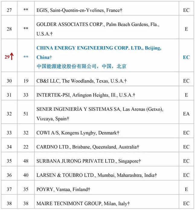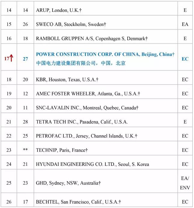 日前,全球工程建設(shè)領(lǐng)域最權(quán)威的學(xué)術(shù)雜志——美國(guó)《工程新聞紀(jì)錄》(ENR)雜志公布了2017年度國(guó)際225強(qiáng)工程設(shè)計(jì)企業(yè)排名。中國(guó)電建排名第17位,繼續(xù)在中企中位列第一;中國(guó)能建排名第29位,在中企位列第二。(本
