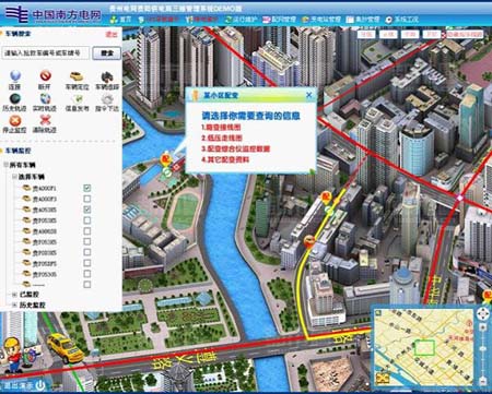 3、可對供電局裝有GPS設(shè)備的車輛和工作人員進行定位。并計算出到客戶的距離和手中的任務(wù),方便監(jiān)督搶修、巡線、抄表、用電檢查等工作。