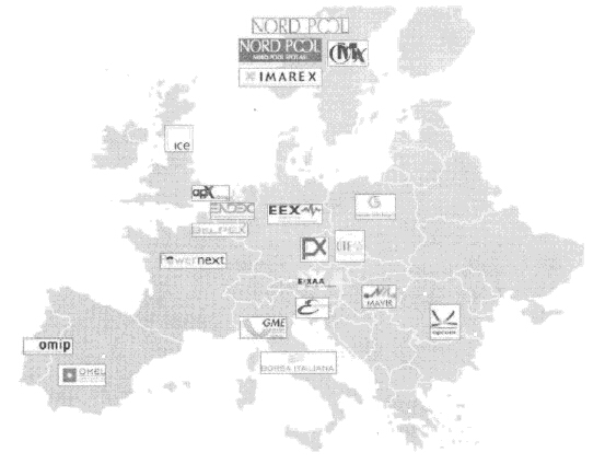 目前歐洲較大的電力交易所包括:歐洲能源交易所(EEX)、歐洲電力交易所(EPEX)、北歐電力交易所(NordPool,NP)、阿姆斯特丹電力交易所(APX)、N2EX電力交易所、倫敦洲際交易所(ICE)、伊比利亞電力交易所(MIBEL)、意大利能源交易所(GME)、意大利電力金融衍生品交易所(IDEM)等。