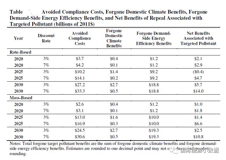 如下表所示,在污染物(包括二氧化碳)總量控制(mass based)目標情境下,如果折現(xiàn)率為7%,那么執(zhí)行清潔電力計劃所帶來的美國本土排污收益損失為每年5億美元、需求側(cè)能效改善收益為193億美元,二者合計收益為198億美元;然而,執(zhí)行清潔電力計劃本身所需要的投資成本高達306億美元。這樣,把成本與收益相抵,取消清潔電力計劃還可以“節(jié)省”108億美元。即便在折現(xiàn)率為3%的假設(shè)下,那么取消清潔電力計劃仍有25億美元的凈“收益”。