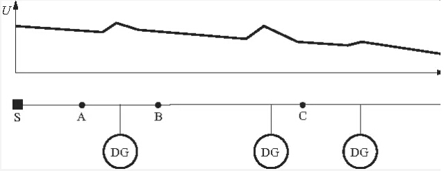 分布式電源的接入對(duì)饋線的電壓具有抬升作用,而且對(duì)于出力受自然因素影響的分布式電源(如光伏、風(fēng)電等),由于其波動(dòng)性還會(huì)產(chǎn)生電壓波動(dòng),并且對(duì)其接入點(diǎn)的電壓抬升作用和電壓波動(dòng)作用最大。對(duì)于接入多臺(tái)分布式電源的饋線,其沿線電壓分布就如同在各個(gè)分布式電源處分別由一個(gè)小棍頂著一般,在各個(gè)分布式電源的接入點(diǎn)形成一個(gè)個(gè)電壓極值點(diǎn),見(jiàn)圖1。圖中,S為該饋線的變電站出線斷路器,A、B和C為分段開(kāi)關(guān),DG為分布式電源,曲線縱軸U 代表沿線電壓。