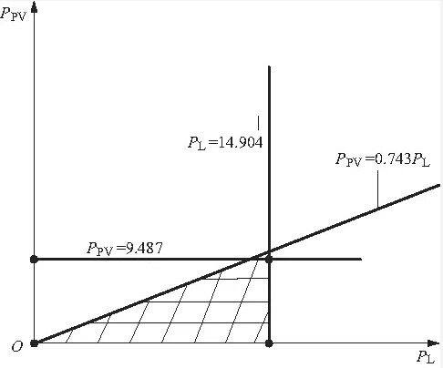 例如,對于一條負(fù)荷功率沿饋線遞增分布、分布式光伏電源容量沿饋線均勻分布的饋線,采用YJV-120型電纜,在容載比為75%的情況下,分布式光伏電源的允許接入容量范圍如圖3中陰影區(qū)域所示。圖中,PPV表示分布式電源的容量。由圖可見,即使不對分布式電源進(jìn)行控制,饋線對其的消納能力也很大。