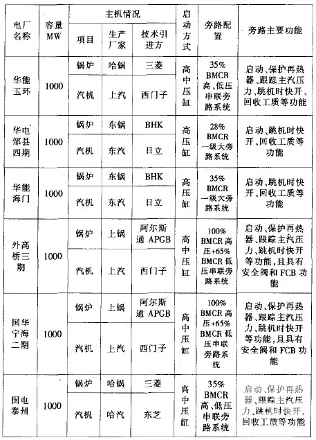 下表是國(guó)內(nèi)部分已投產(chǎn)或正在實(shí)施的百萬(wàn)超超臨界機(jī)組旁路設(shè)置情況。