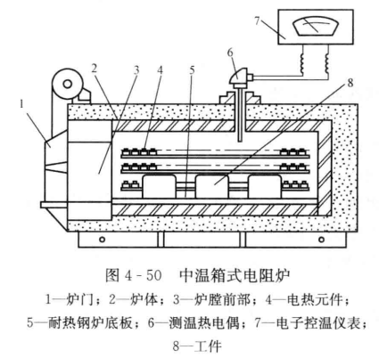 ①中溫箱式電阻爐應(yīng)用最為廣泛,常用于碳素銅、合金鋼零件的退火、正火、淬火及滲碳等,如圖4-50所示。