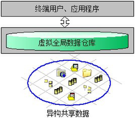 挑戰(zhàn)的解決方案,它提供了一種基礎設施,允許安全地訪問任何信息源,而不需要關注其位置和數(shù)據(jù)的類型。網(wǎng)格的信息基礎設施是訪問異質(zhì)文件、數(shù)據(jù)庫、存儲系統(tǒng)等的基礎設施,并支持在計算處理和大規(guī)模協(xié)作過程中實現(xiàn)數(shù)據(jù)共享。這樣的基礎設施允許對跨越異質(zhì)硬件和軟件資源的數(shù)據(jù)庫、文件、存儲設備等進行管理。這樣需要首先將數(shù)據(jù)虛擬化。從訪問的角度來說,一種數(shù)據(jù)大致可以用三個特征來描述,即數(shù)據(jù)(元數(shù)據(jù))、文件系統(tǒng)和儲存介質(zhì)(以及位置),因此,虛擬數(shù)據(jù)庫涉及三個層次的虛擬化,即數(shù)據(jù)的虛擬化、文件系統(tǒng)的虛擬化和存儲介質(zhì)的虛擬化。這樣,最終為用戶提供一個巨大的全局虛擬數(shù)據(jù)倉庫供訪問,如圖 5所示。