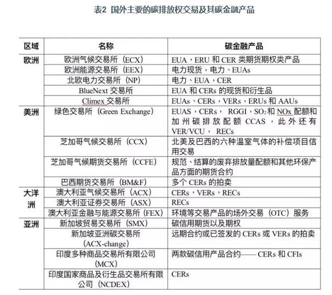 碳市場出現(xiàn)以后,相應(yīng)的碳排放配額和碳減排信用交易也相應(yīng)出現(xiàn),交易所根據(jù)政策規(guī)定設(shè)計(jì)相應(yīng)的標(biāo)準(zhǔn)化合約產(chǎn)品,并提供交易的平臺,為碳市場提供流動(dòng)性,幫助碳市場參與者平抑風(fēng)險(xiǎn)。目前國際典型的碳金融交易工具主要包括碳遠(yuǎn)期交易、碳期權(quán)、碳期貨以及碳金融產(chǎn)品的證券化四個(gè)大類(見表2)。一方面,開展碳交易權(quán)期貨及衍生品交易,可以提供高效的信息交流平臺,形成公開透明的交易價(jià)格,既方便買賣雙方尋找交易對手,也為相關(guān)企業(yè)的排放權(quán)現(xiàn)貨交易提供權(quán)威公正的定價(jià)機(jī)制;另一方面可為相關(guān)現(xiàn)貨企業(yè)提供有效的避險(xiǎn)工具,由于排放權(quán)項(xiàng)目建成以后需要運(yùn)行較長時(shí)間,在此期間所產(chǎn)生的減排量價(jià)格也在不斷變化,通過碳排放權(quán)衍生品交易可以有效規(guī)避價(jià)格風(fēng)險(xiǎn)。