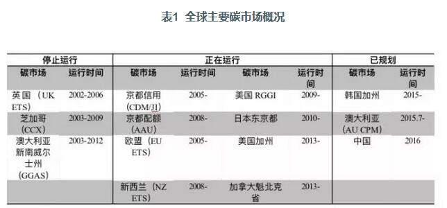 目前世界上還沒有統(tǒng)一的國際排放權(quán)交易市場。在區(qū)域市場中,也存在不同的交易商品和合同結(jié)構(gòu),各市場對交易的管理規(guī)則也不相同。目前全球共有16個(gè)區(qū)域性、國家級和次國家級的碳交易體系在運(yùn)轉(zhuǎn),包括歐盟整個(gè)區(qū)域和美國的部分州在內(nèi)。主要的碳交易市場如表1所示。