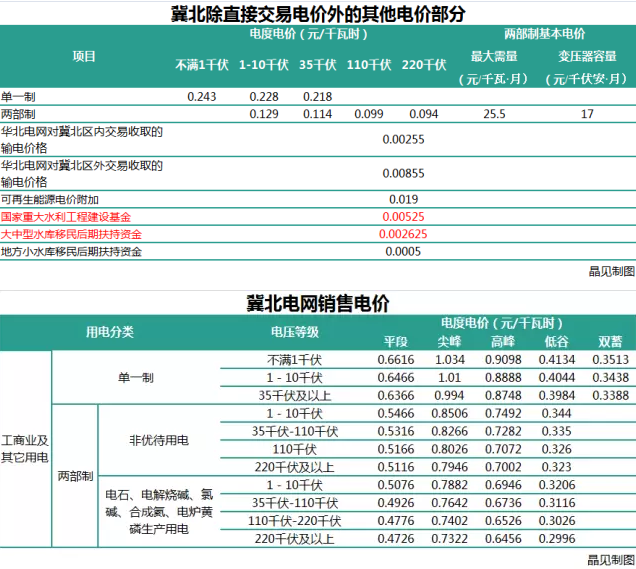 冀北的用戶側(cè)電價(jià)計(jì)算方式跟天津的一樣,按照以下圖中對(duì)應(yīng)的價(jià)格計(jì)算同樣能算出冀北區(qū)內(nèi)和區(qū)外交易的最終電價(jià)。為方便大家對(duì)比晶見工作室還把冀北的銷售電價(jià)整理最下面的一張圖哦。