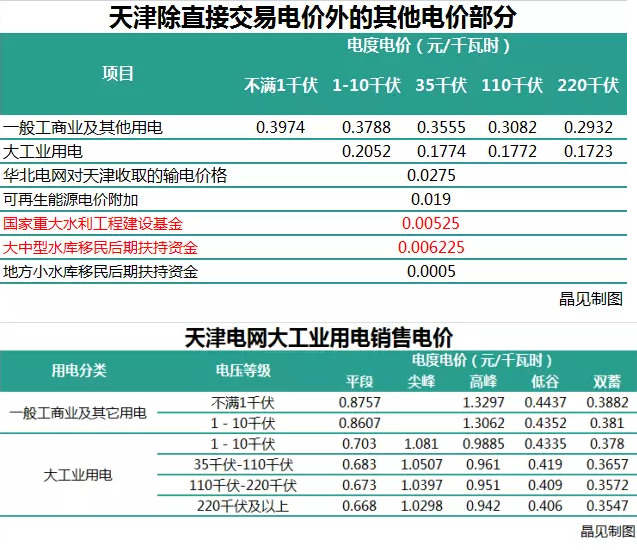所以天津除直接交易價(jià)格外的其他電價(jià)和天津電網(wǎng)銷售電價(jià)如下圖: