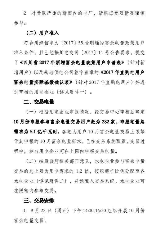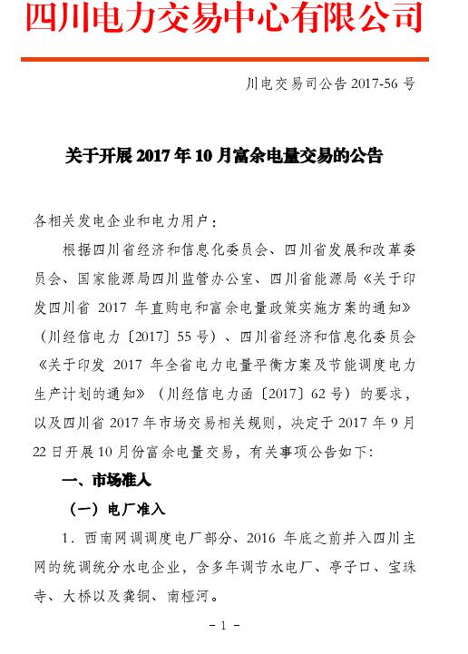2017年9月21日四川電力交易中心發(fā)布《關(guān)于開展2017年10月富余電量交易的公告》。9月22日(周五)下午14:00-16:30組織開展10月份富余電量交易。根據(jù)用電企業(yè)申報情況,經(jīng)交易中心審核后確定10月份申報參與富余電量