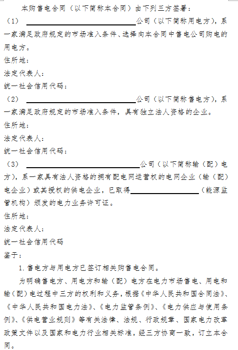 本網(wǎng)獲悉,國(guó)家能源局江蘇監(jiān)管辦日前發(fā)布了《售電公司與電力用戶(hù)購(gòu)售電合同(示范文本)》《江蘇電網(wǎng)公司(輸配電公司)、售電公司、電力市場(chǎng)化零售用戶(hù)三方購(gòu)售電合同(示范文本)》。各有關(guān)單位要在開(kāi)展電力用戶(hù)直接