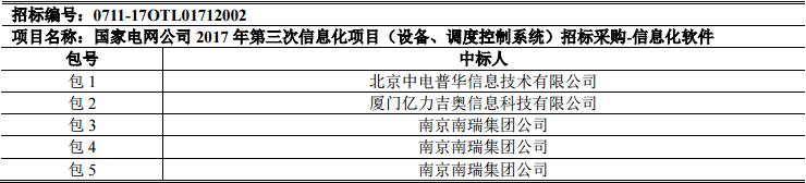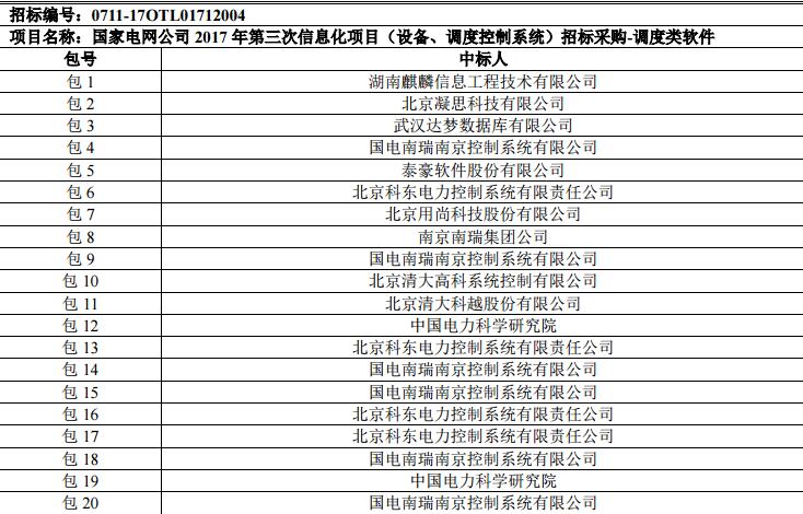國家電網(wǎng)公司2017年第三次信息化項目招標(biāo)采購中標(biāo)情況招標(biāo)編號:0711-17OTL01712001-12004、0711-17OTL01812005