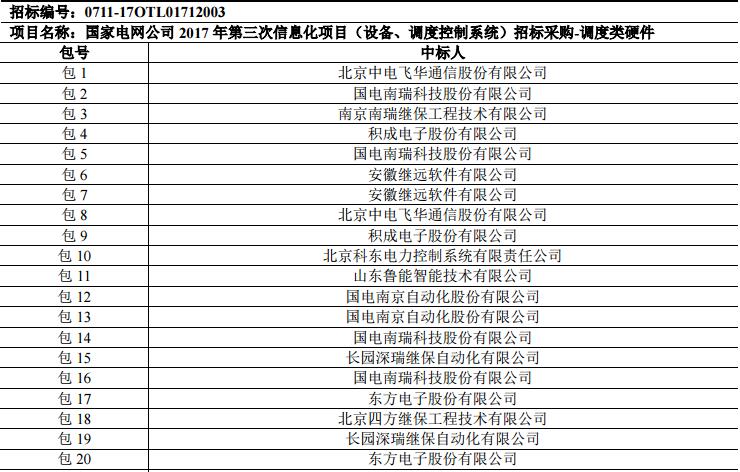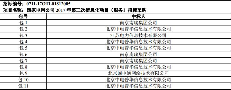 國家電網(wǎng)公司2017年第三次信息化項目招標(biāo)采購中標(biāo)情況