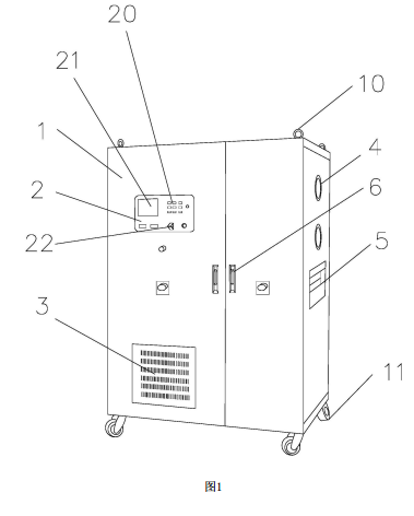 圖中:柜體-1、容量控制器-2、散熱柵-3、電抗器-4、雙向變流器-5、把手-6、連接孔-10、滾輪-11、匯流器-50、控制器-51、光伏陣列-52、扶手-53、控制按鈕-20、顯示屏-21、電源按鈕-22。