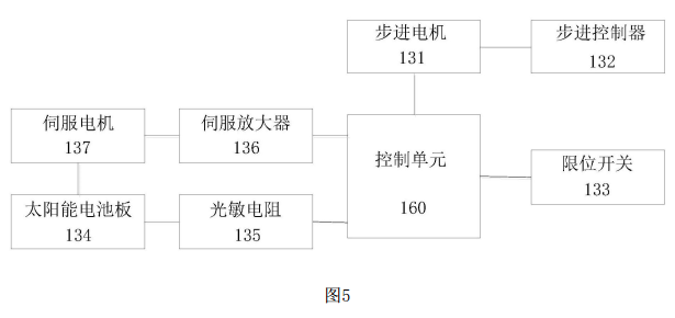 進一步地,所述光伏發(fā)電單元還包括太陽能電池板、光敏電阻、伺服放大器以及伺服電機,所述光敏電阻設(shè)置于所述太陽能電池板,所述伺服放大器分別與所述伺服電機和所述控制單元連接,所述伺服電機與所述太陽能電池板連接;