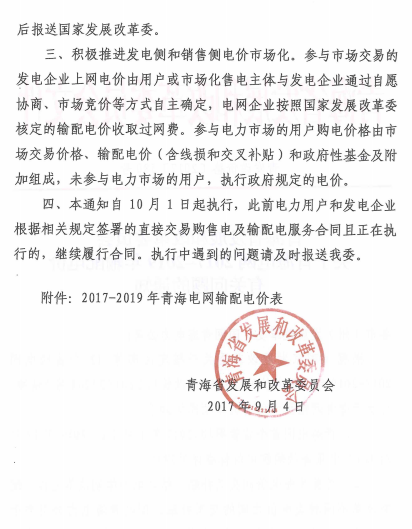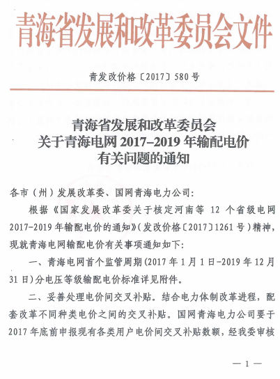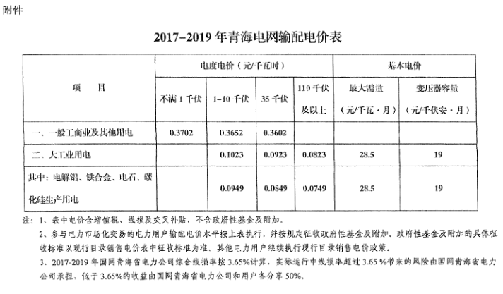 青海電網(wǎng)2017-2019年輸配電價(jià)公布