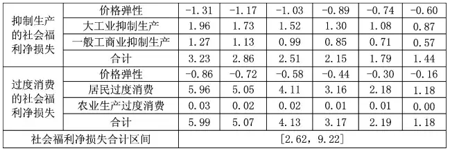 考慮到不同價(jià)格彈性估計(jì)方法有不同的結(jié)果,本文綜合采用林伯強(qiáng)(2011)、何永秀(2003)和程瑜,張粒子(2003)等估計(jì)的電力需求價(jià)格彈性的結(jié)果,工業(yè)價(jià)格彈性和居民價(jià)格彈性區(qū)間分別為[-1.31,-0.60]和[-0.86,-0.16];假設(shè)商業(yè)與工業(yè)彈性一致,農(nóng)業(yè)生產(chǎn)與居民彈性一致。由交叉補(bǔ)貼福利損失模型分析其帶來(lái)的社會(huì)福利凈損失如表2。